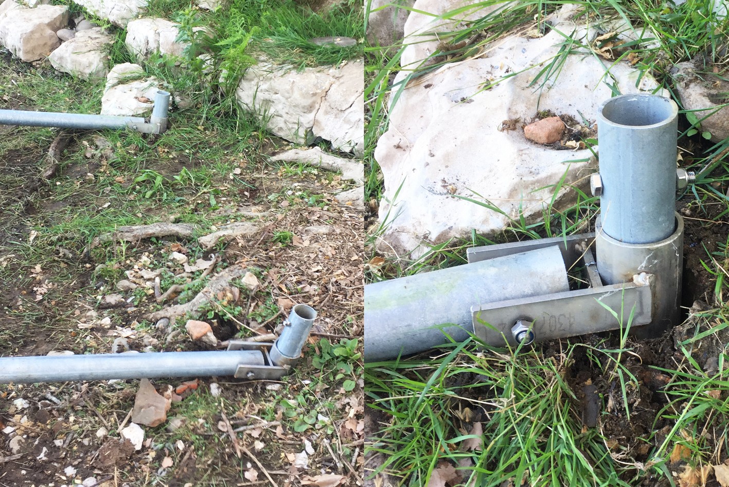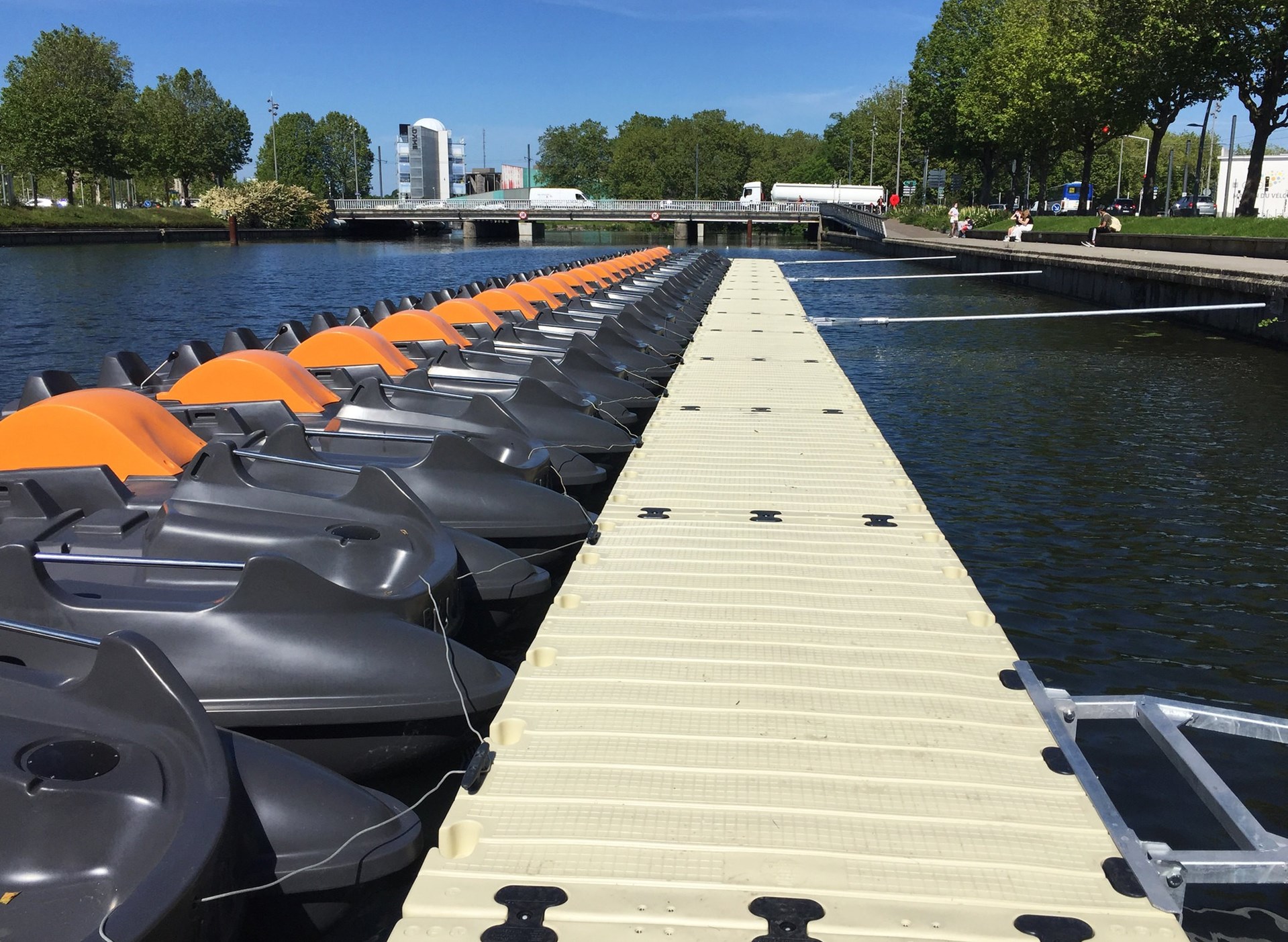 Bügel aus verzinktem Stahl, der mit 6 halben Koppelstücken am Ponton befestigt ist.